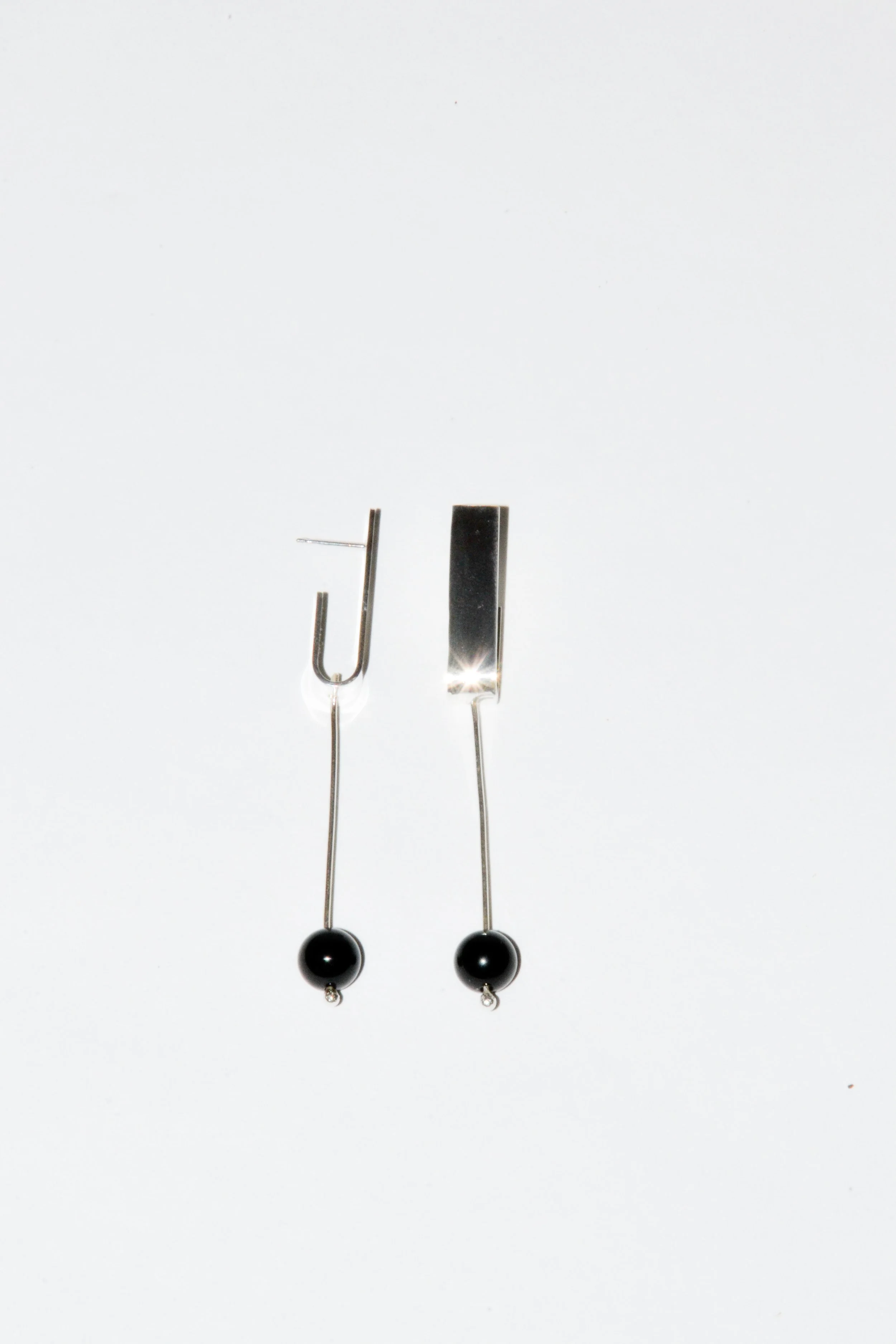 A mobile composition featuring a gently swinging pearl suspended from a minimal silver stem. Sold individually - price is per unit (earring).
