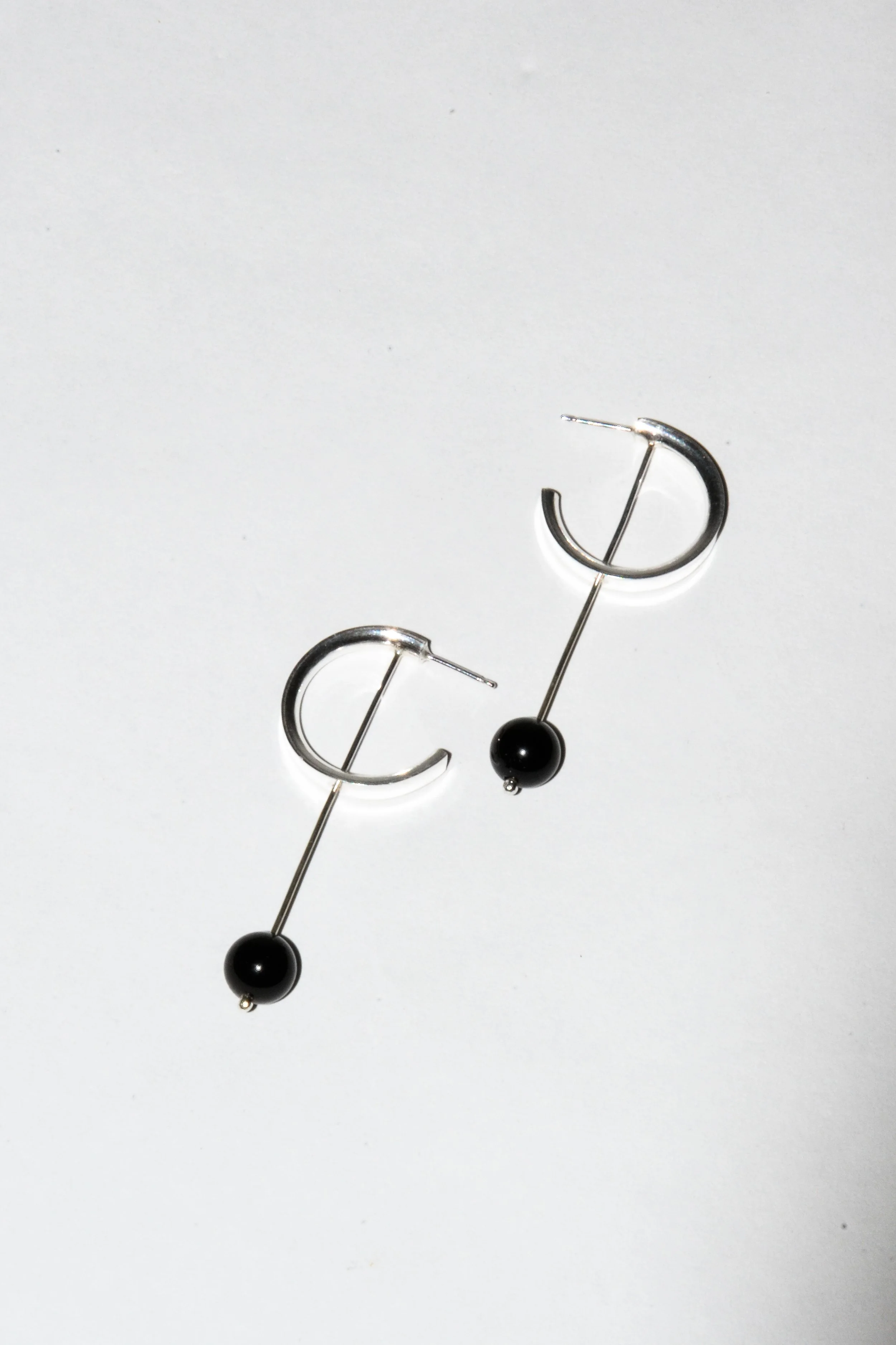 Sculptural hoop intersected by a fine silver wire, anchoring a single pearl in quiet balance. Sold individually - price is per unit (earring).